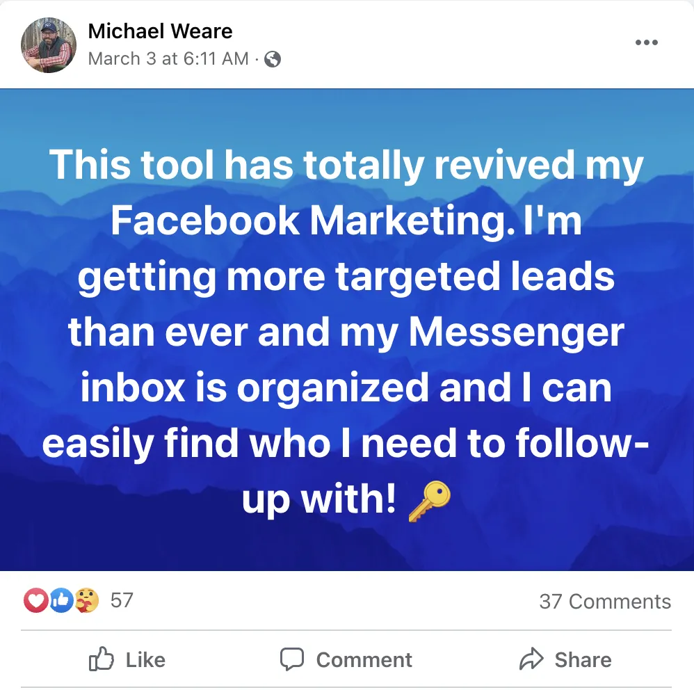 Organize your messenger inbox by creating color-coded tags like “Follow Up”, “Hot Lead”, “Interested” etc. and tag people inside your Facebook messenger. You will know exactly who a person is and where that person is in your sales cycle.